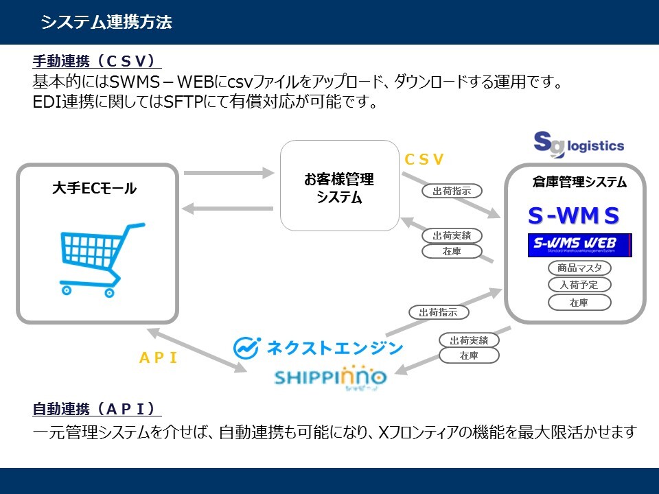 通常倉庫では翌日の日中に倉庫内にて出荷作業を行っていました。 Xフロンティアでは出荷キャパシティが向上し、 お客様のWeb上での出荷ステータスが、 ''出荷準備中"から''出荷済''へ速やかに変化する事が可能となります。